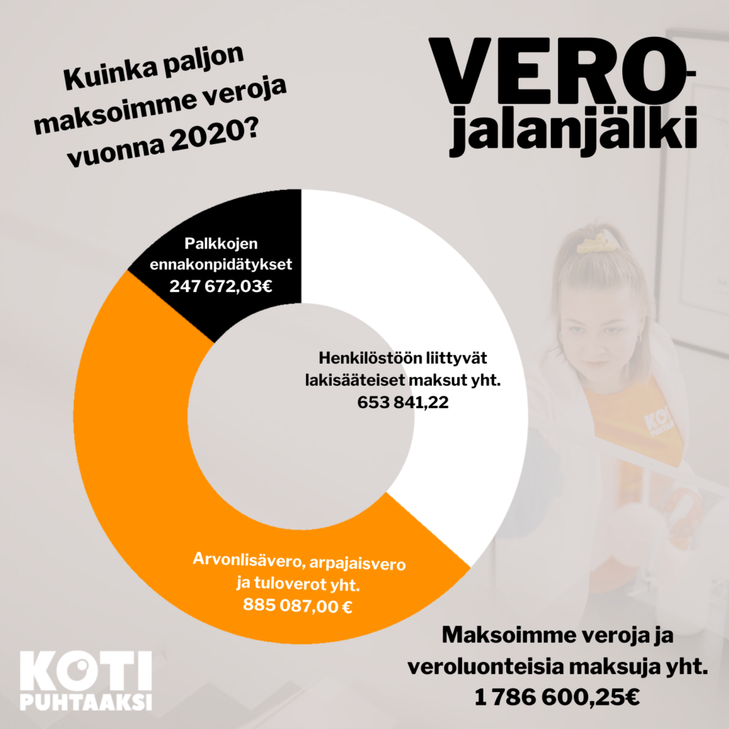 Verojalanjälki tarkoittaa yrityksen yhteiskunnalle maksamia veroja ja veroluonteisia maksuja. Nämä koostuvat arvonlisäveron ja yrityksen tuloveron lisäksi palkkojen ennakonpidätyksistä sekä henkilöstöön liittyvistä lakisääteisistä maksuista. Pureskellaanpas läpinäkyvän ja vastuullisen yrittäjyyden nimissä vuoden 2020 verotulokset!